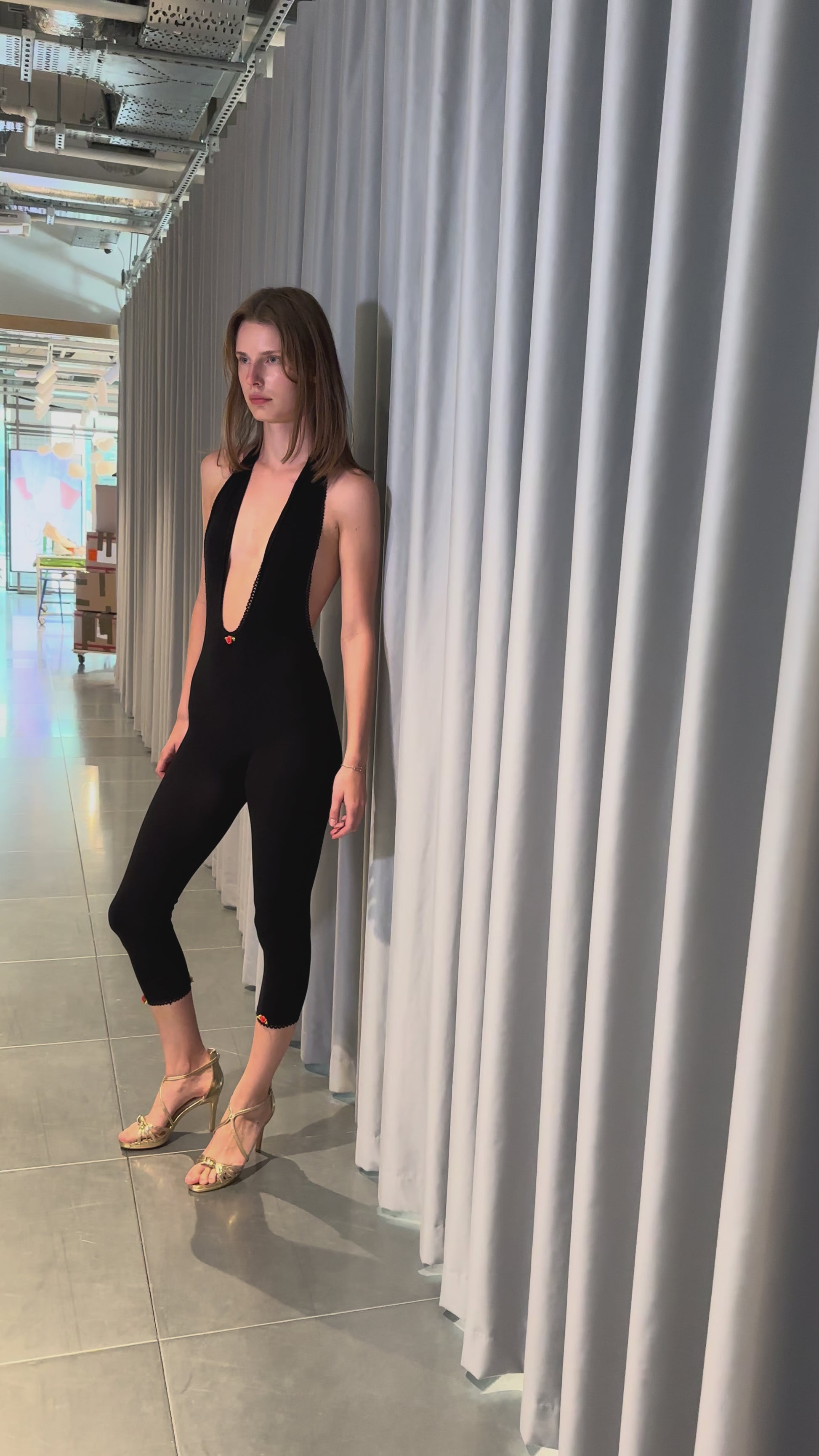 “English Rose” Halter-Neck Capri Jumpsuit in Black with Tricot Trim