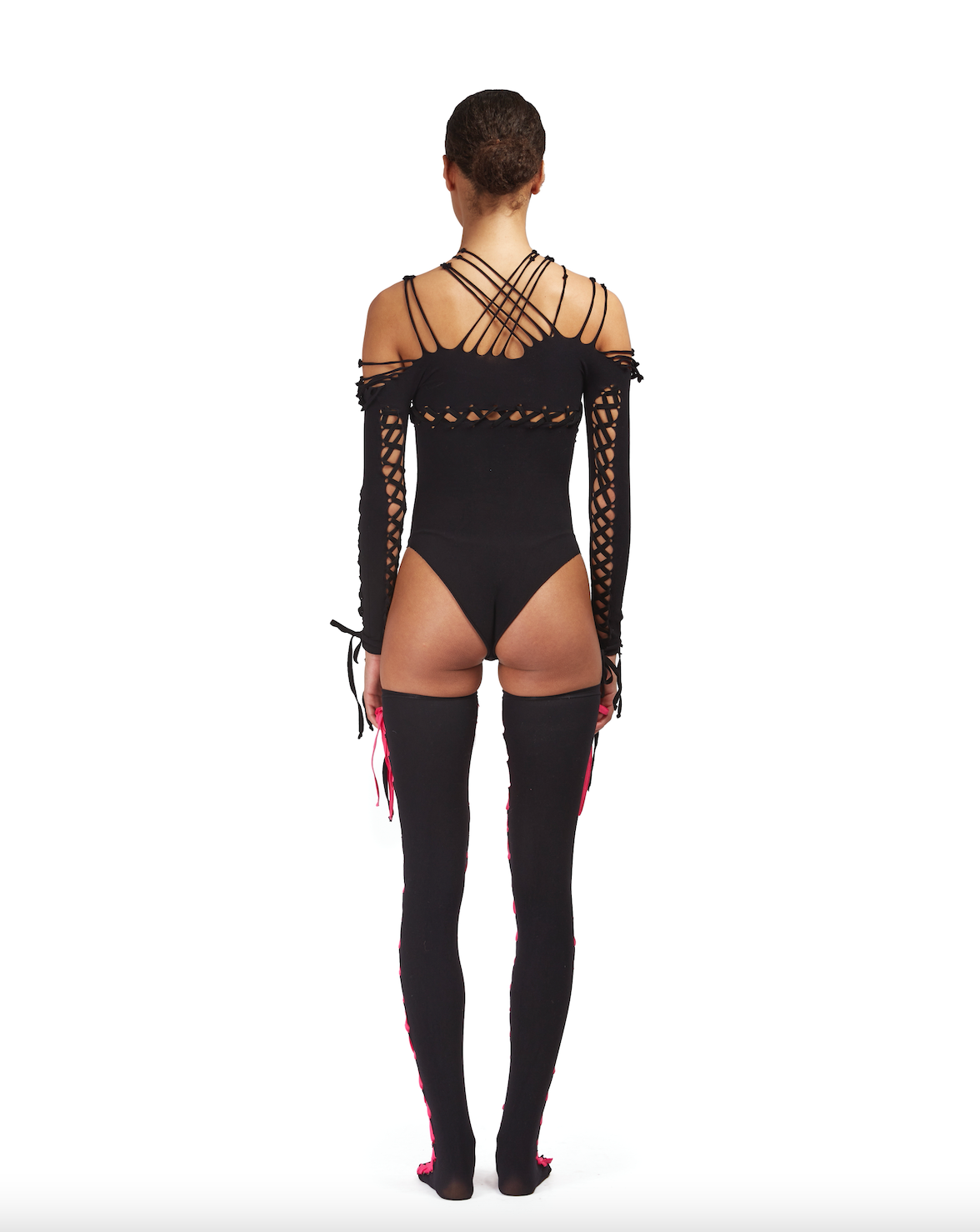 Seamless body-suit with lace up detailing and rhinestone hand-prints