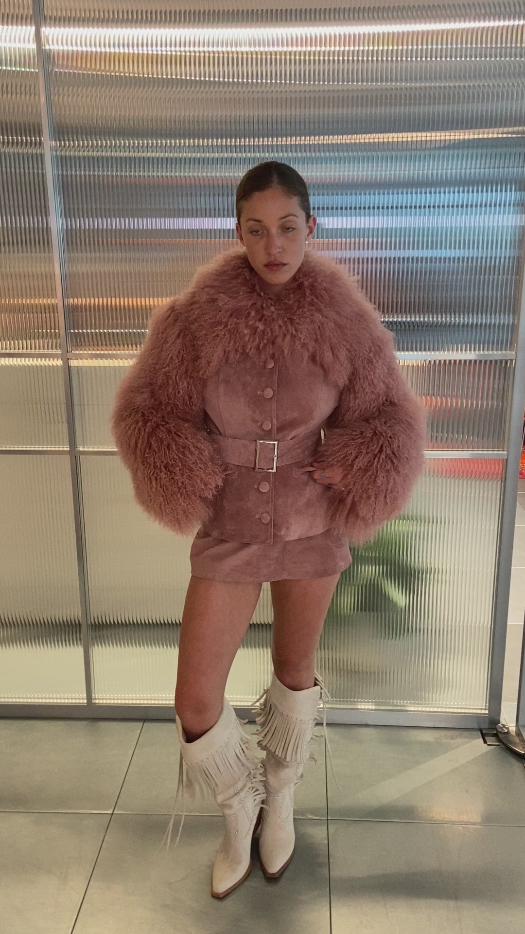 Suede A-Line Tailored Coat with Mongolian Fur Sleeves and Collar, with Removable Waist Belt. The Perfect Winter Warmer! - in colour dusty pink.